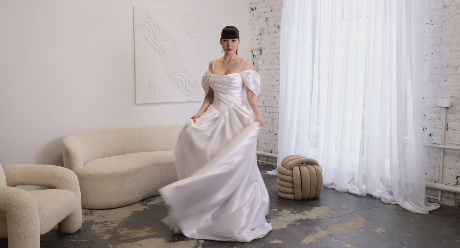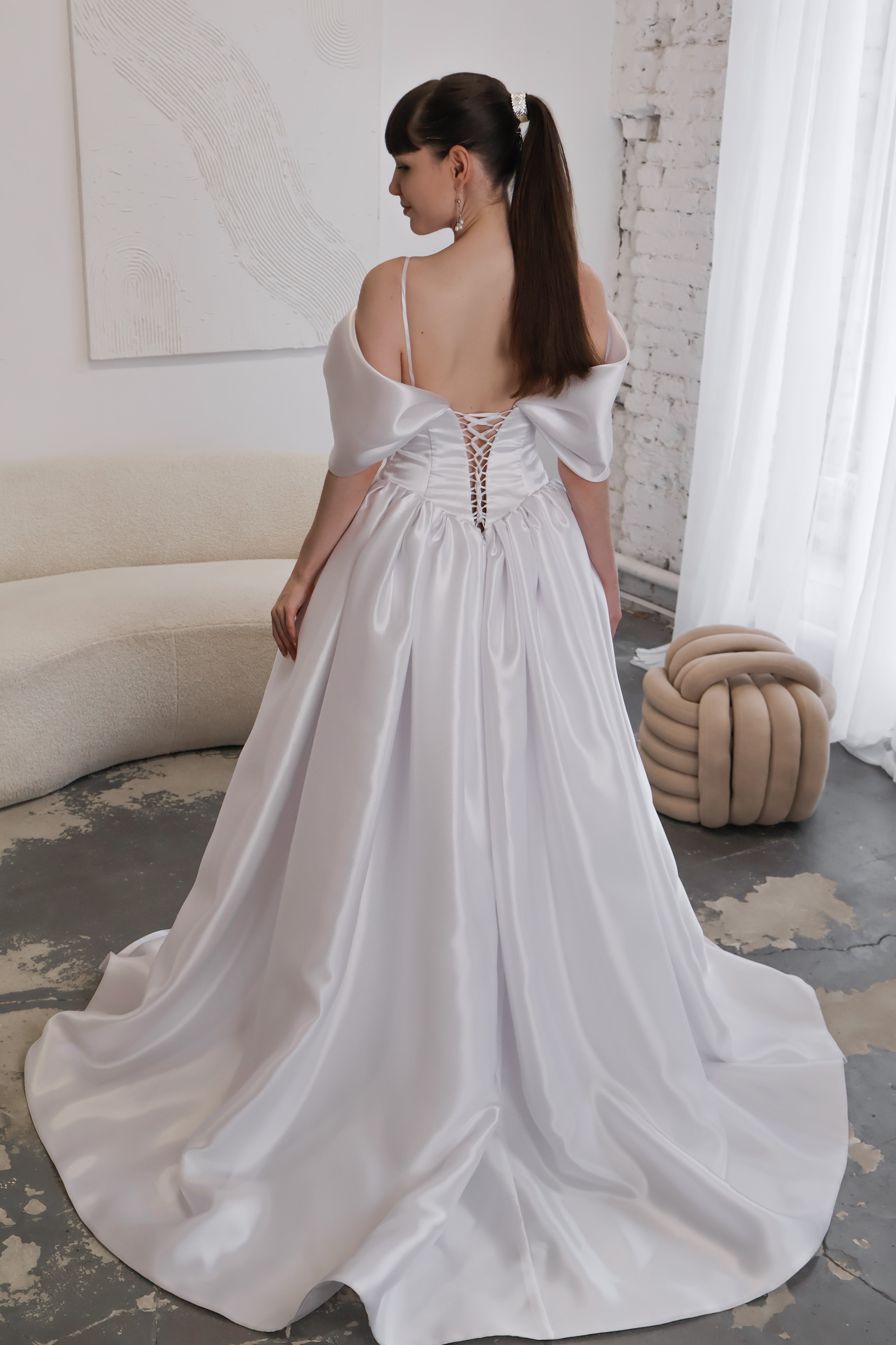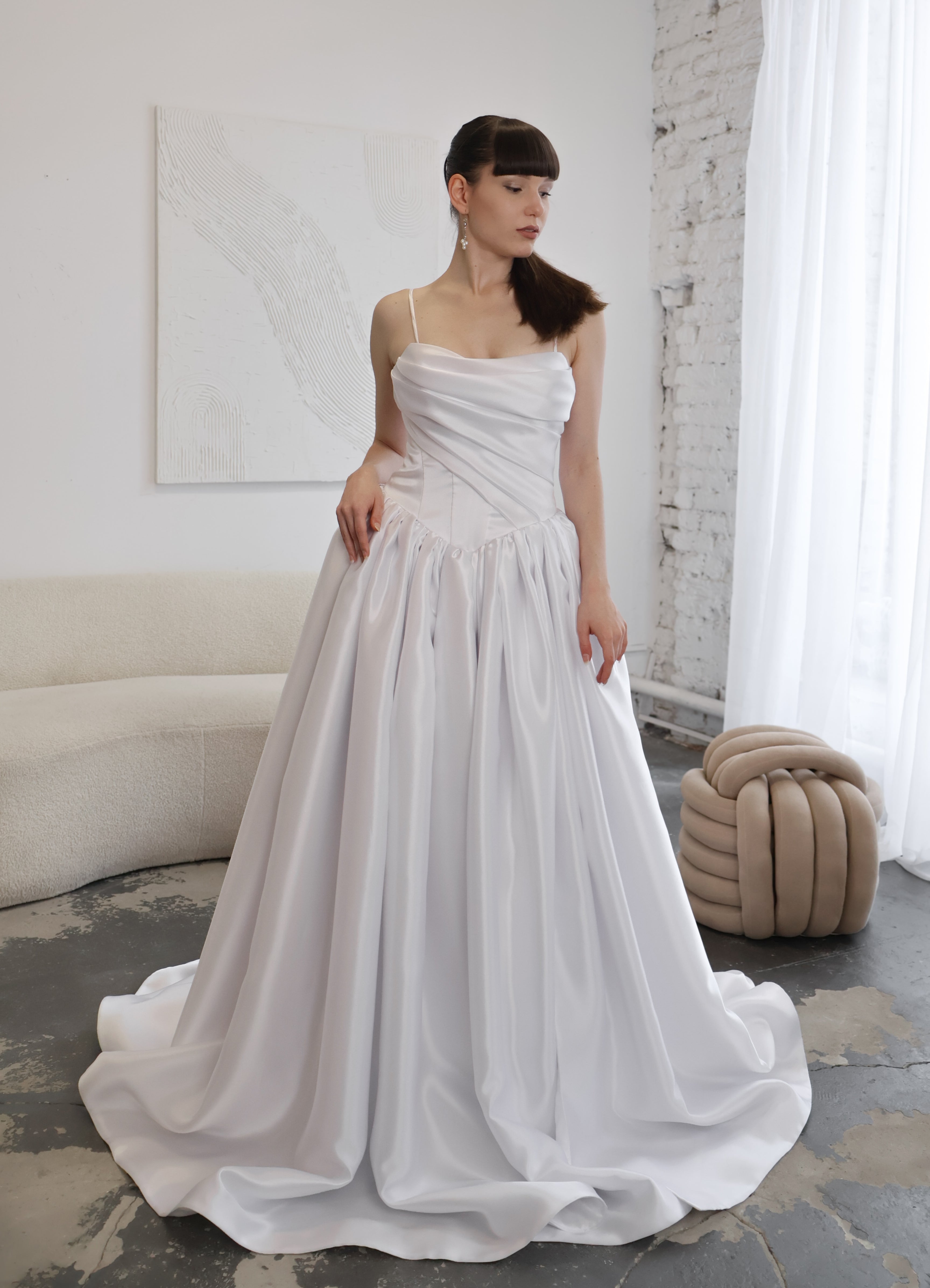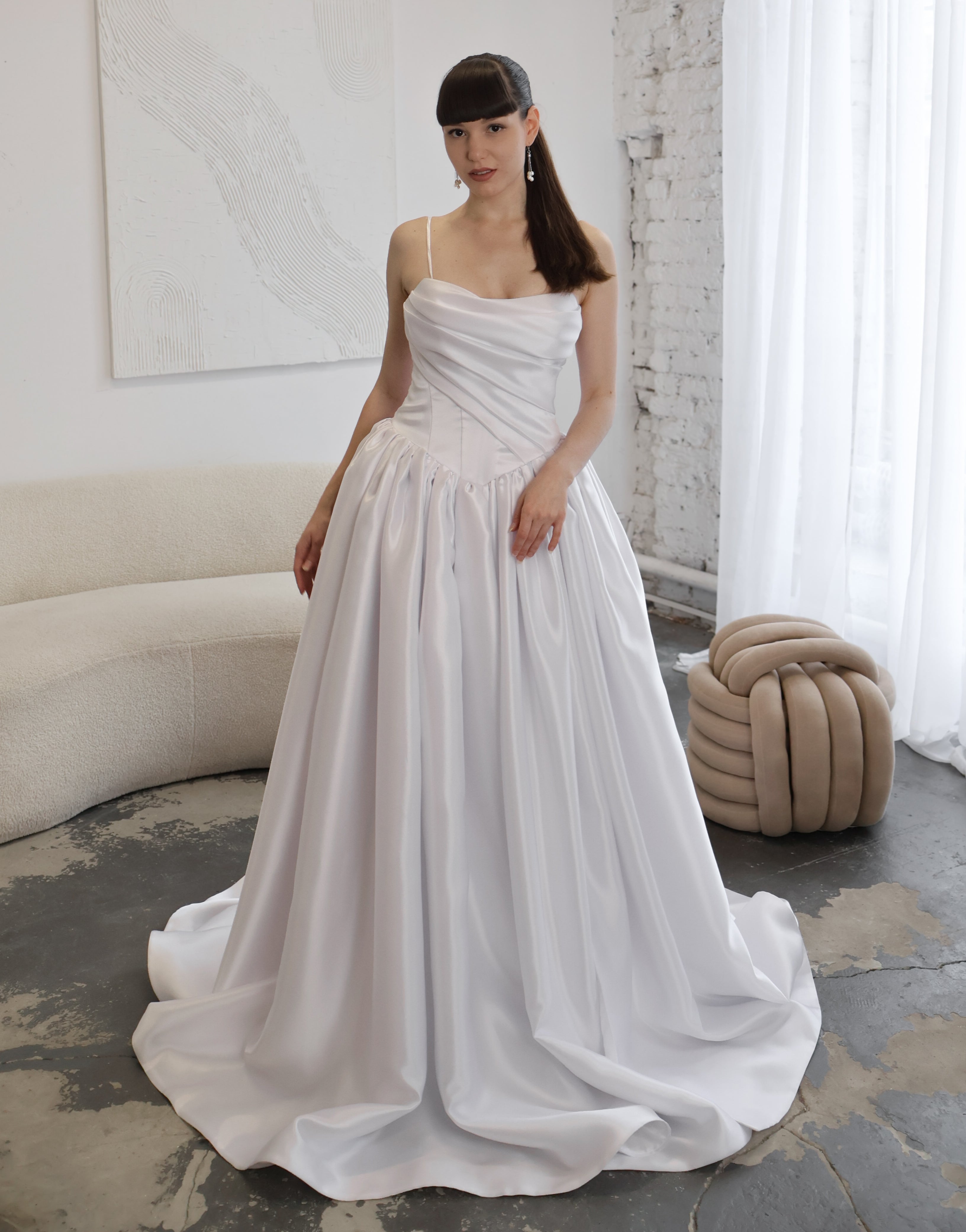 Minimalistyczna suknia ślubna o kroju księżniczki z gorsetem wyszczuplającym oraz obniżoną talią. Ingrid odzwierciedla stonowaną elegancję i ponadczasowy szyk.